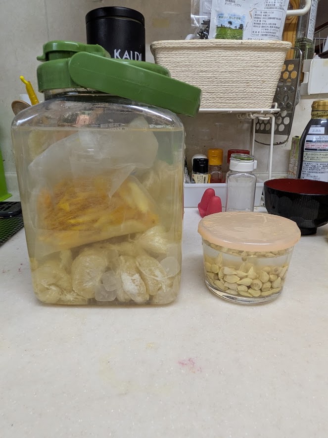 種、これも集めて容器に入れ35度のリカーにつけましょう。種がひたひたにつかるくらいがよい。