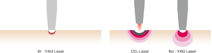 Er:YAGレーザーは、蒸散という反応が照射部の表層に限定されて行われるため、CO2 Laser、Nd : YAG Laserに比べ、透過光による組織深部への影響が少なくてすみます。